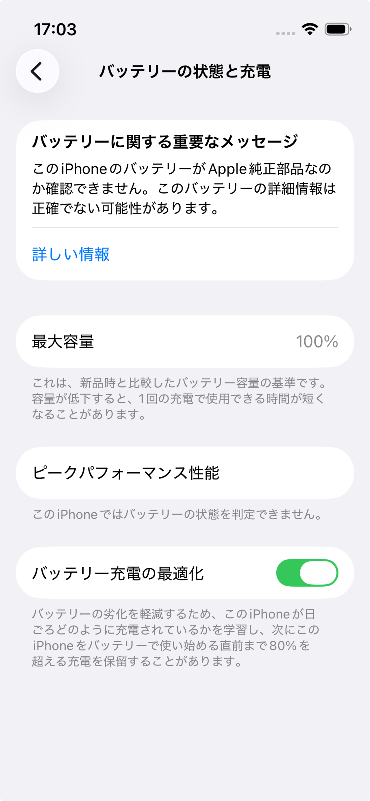 iOS18.1からバッテリーの最大容量が表示されるようになりました。設定画面上の不明な部品・バッテリー未確認などの表示は以前のバージョンから継続になります。