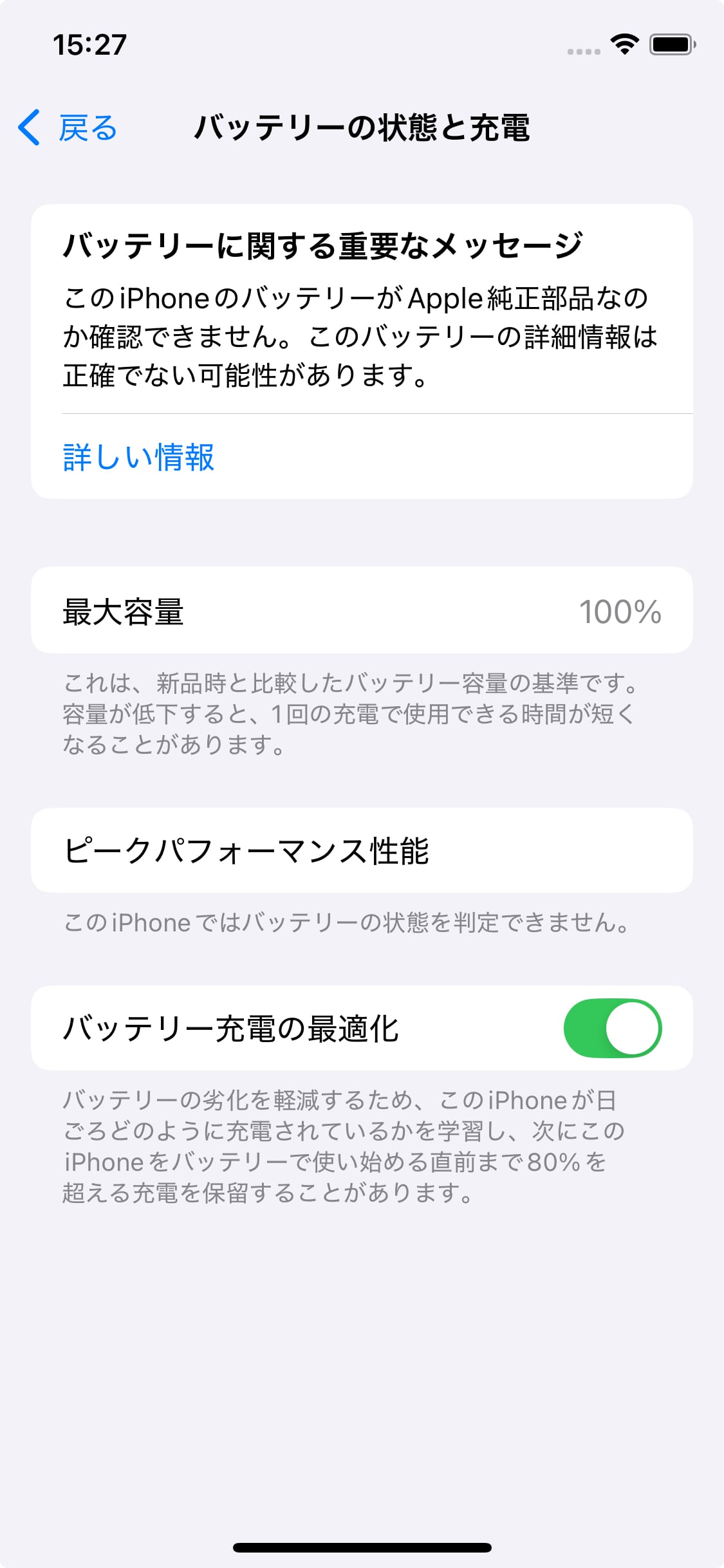最大容量は100%と表示されますが、劣化状況が最大容量に反映されない可能性があります。