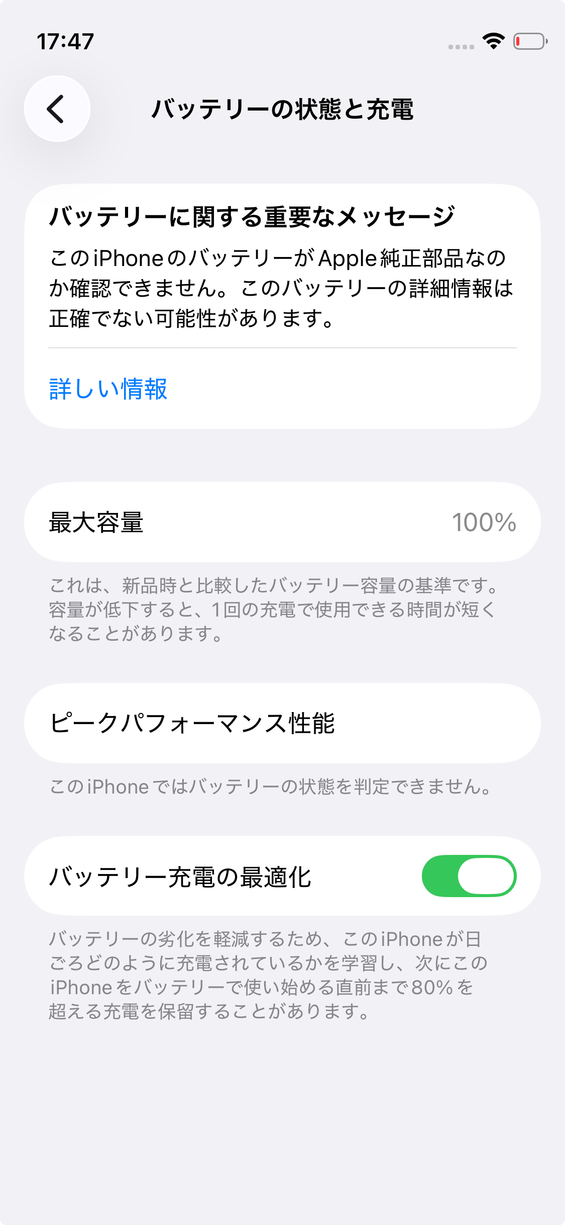 iOS18.1からバッテリーの最大容量が表示されるようになりました。設定画面上の不明な部品・バッテリー未確認などの表示は以前のバージョンから継続になります。